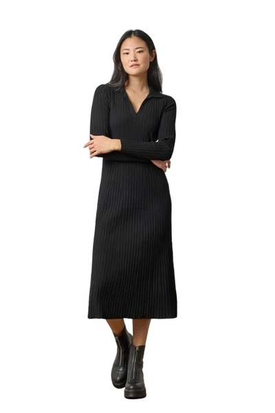 Long Sleeve Rib Henley Dress | Black