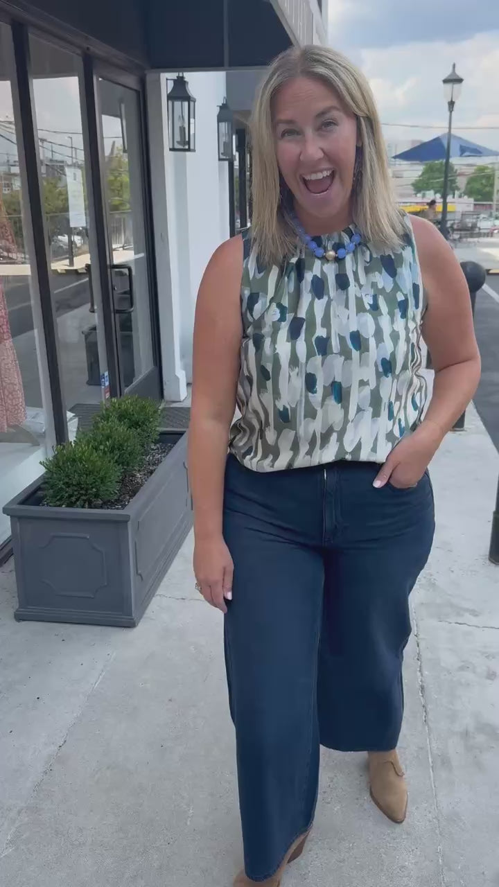 The Pia Top features a soft, round neckline and a beautiful print in green, navy, and ivory. Its versatile design pairs effortlessly with black pants or any skirt, making it an ideal choice for both casual and dressier occasions. Comfortable and stylish, this top will seamlessly complement your wardrobe.
