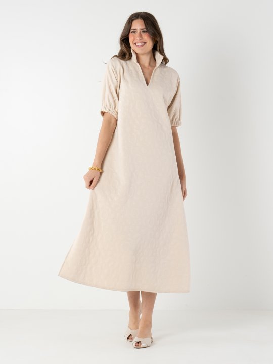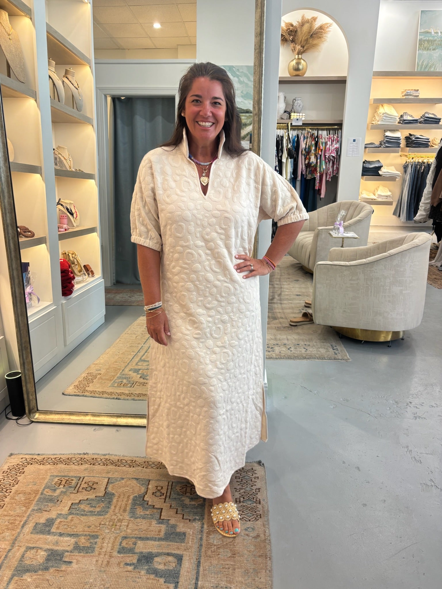 Luxe lounging has never been more effortless. The Poppy Maxi in Sandstone Cheetah / Quilt Jacquard provides functional versatility without compromising style. A breezy silhouette is complimented with loose elastic dolman sleeves and a classic popped collar. The ideal maxi dress for lounging, while also easily transitioning into everyday wear with a sneaker or loafer!