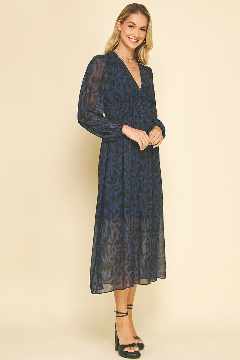 The Iris Dress in Navy features elegant tone-on-tone patterns and delicate sheer sleeves and hem, making it an ideal choice for the transition from summer to fall. Its lightweight design ensures you stay comfortable without overheating, while the subtle details add a touch of sophistication to your wardrobe. Perfect for layering or wearing on its own, this dress supports your style through changing seasons with ease.